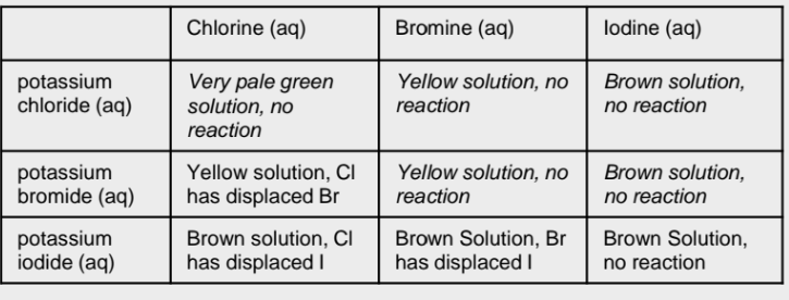 Describe the colour of the solution when you react chlorine, bromine and Iodine to metal halides