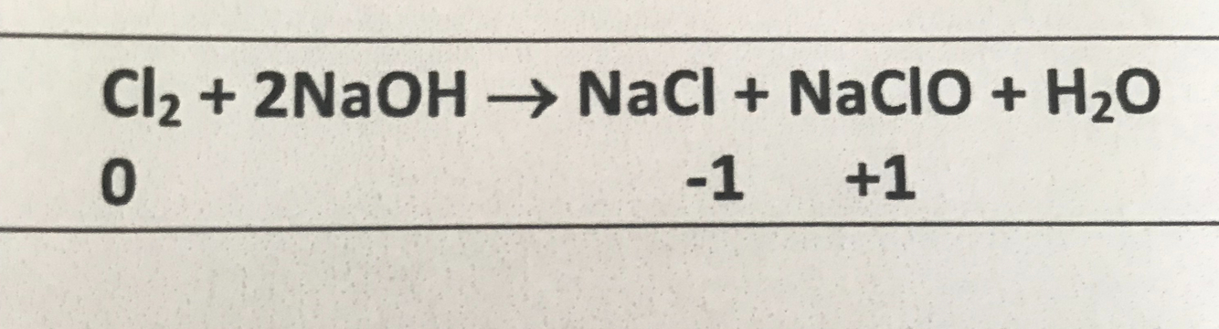 How is chlorine used to make bleach? Write down the equation with the oxidation states.