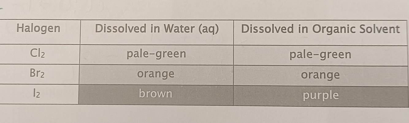 Draw the table that shows the different colours of the displacement of Chlorine, Bromine and Iodine when either dissolved in water or an organic solvent