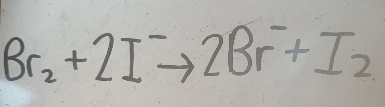 When Bromine is added to a solution of Potassium Iodide, the solution becomes brown due to the formation of Iodine. Write the ionic equation for this.