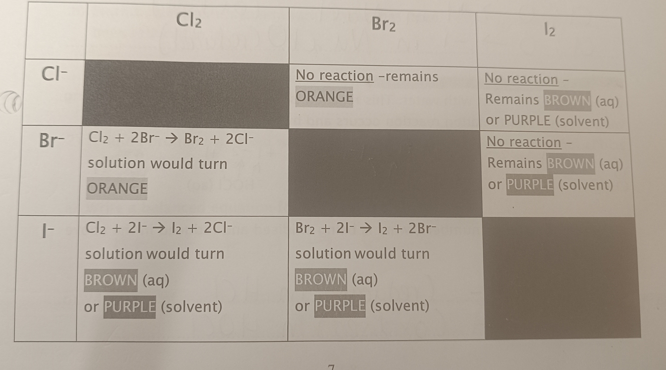 Draw the displacement summary table (include what would happen in the reaction between Cl, Br and I molecules and ions, and what colour would be formed in both water and organic solvents