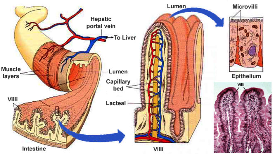 [*] The small intestine is very long and the surface area for absorption is increased by millions of villi (folds of mucosa) projecting into the lumen.