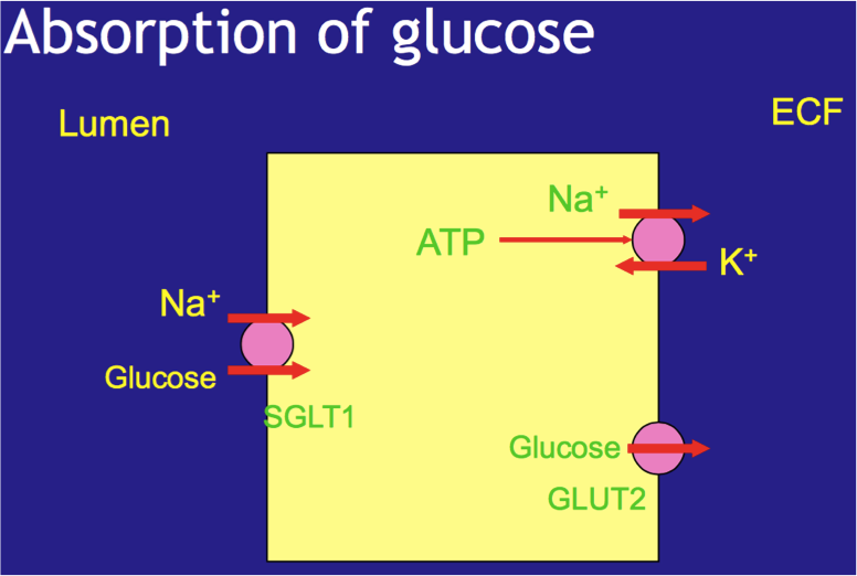 [*] Glucose is absorbed actively using energy from sodium gradient. Glucose enters mucosal cells via Na+/glucose transporter (SGLT1)