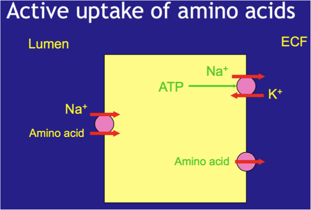 [*] Active uptake of amino acids: at least 5 Na+/amino acid co transporters. Like the uptake of glucose.