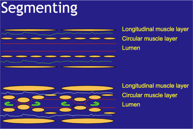 [*] Segmenting itself does not propel contents along the intestine. It merely mixes and agitates them. The intestinal gradient however, means that differential segmenting rates in adjoining sections of the intestine cause a net movement of material in a caudal direction, albeit at a slow rate.