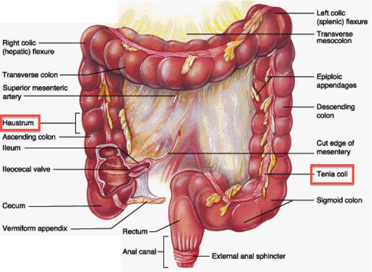 [*] The large intestine is divided naturally into segments known as ‘Haustra’, as the circular muscles are more complete than the longitudinal, which have been reduced to the taenia coli (thickened bands of smooth muscle).