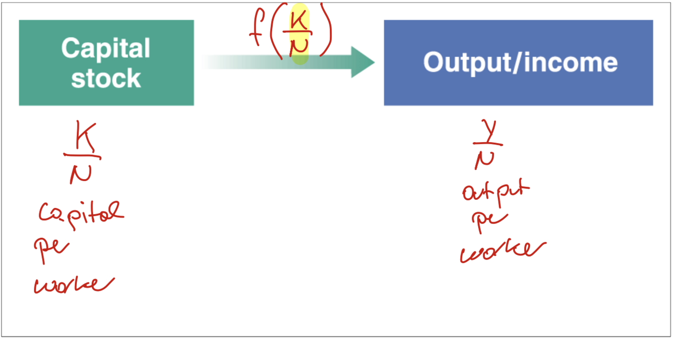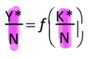 The amount of output per worker, Y/N depends on the capital per worker, K/N
