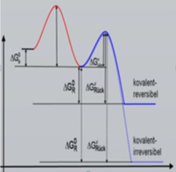 Kovalente irreversible Inhibitoren erreichen nach der Reaktion mit dem Enzym ein niedriges Energieniveau aus dem eine Rückreaktion nicht mehr möglich ist. Deshalb wird die Reaktionskonstante nur noch als kinact beschrieben und nicht länger mit kon bzw. koff.