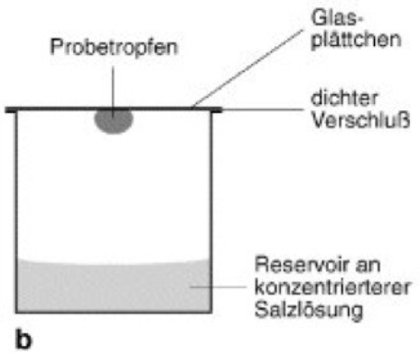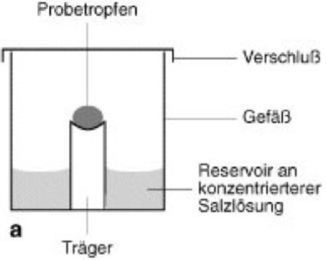 Bei der “Hanging Drop” –Methode wird eine Mischung aus gleichen Teilen Protein und Reservoir verwendet (enthält Niederschlag (Fällungsreagenz), z. B. Ammoniumsulfat). Ein Tropfen dieser Mischung (im Folgenden als analytische Lösung bezeichnet) wird auf eine Glasplatte aufgetragen und dient als Deckel für ein mit konzentrierter Reservoir Lösung gefülltes Gefäß. Die Kristallisation basiert auf der Entfernung von Wasser aus der Analyselösung durch Dampfdiffusion, da die konzentrierte Stammlösung gasförmiges Wasser aus der Umgebungsluft des Behälters absorbiert. Zusätzlich zur Proteinkonzentration im Tröpfchen steigt auch die Konzentration des Fällungsreagens an und das Protein wird aus der Lösung verdrängt.