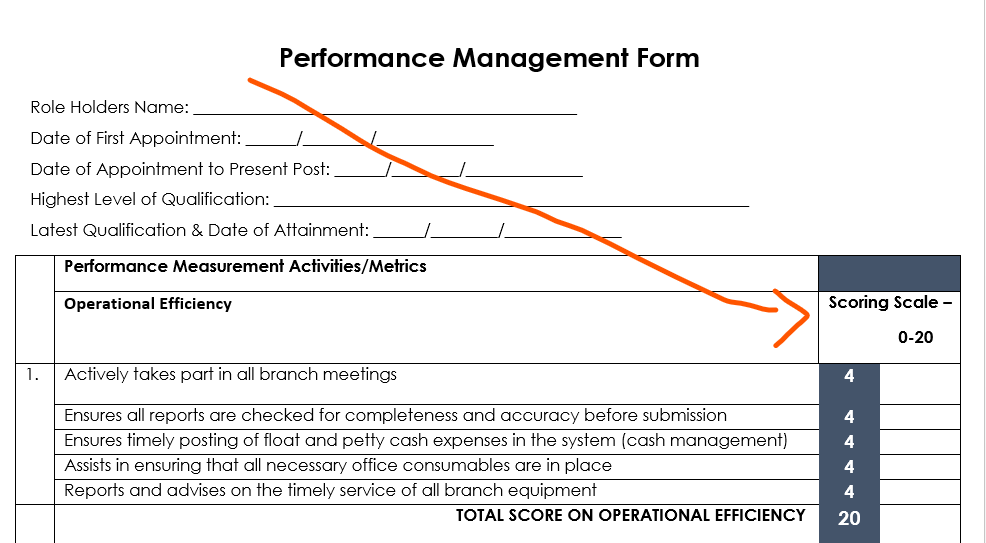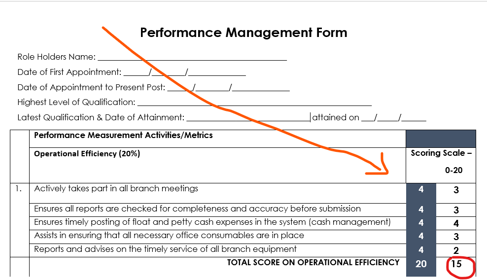 This is the part of the form were the Manager/Supervisor rates the employee’s performance against each activity and gives a score.
