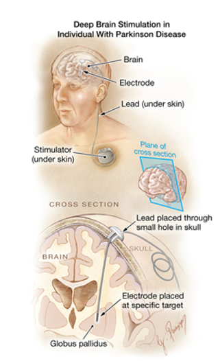 Deep brain stimulation is where an electrode is placed into a specific brain area. This electrode gets connected with a neurostimulator (or so called impuls generator) that gets place somewhere under the skin.
