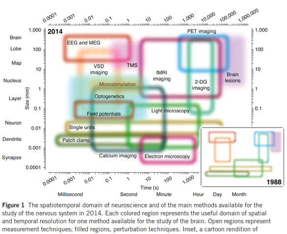 Deep brain stimulation → no cellular resolution, very high temporal resolution..