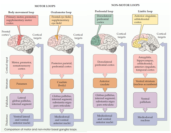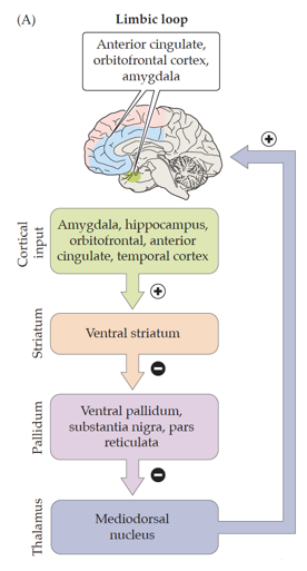 The VTA contains dopaminergic neurons that project to the striatum (part of basal ganglia). The VTA is sensitive to drugs like cocaine that activate these dopaminergic neurons to release dopamine. The increased release of dopamine affects the limbic loop (depicted in picture) and changes gene expression.