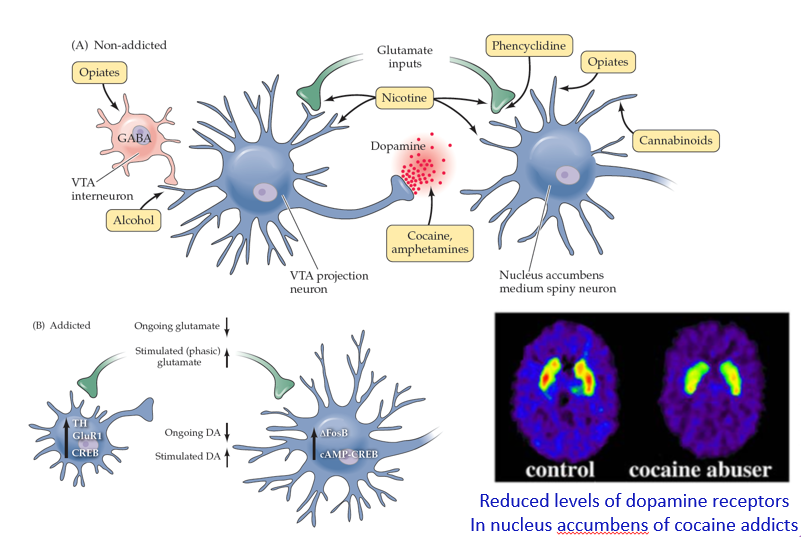 Gene expression is altered and also the amount of dopamine receptor in the nucleus accumbens is drastically diminished (hence why during addiction, over time you need more of the same product to get the same effect).