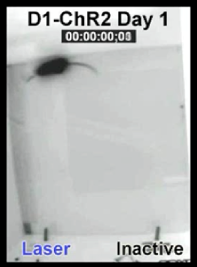 A mouse is modified by optogenetic so that the ventral striatum of the mouse can be stimulated, when the light is turned on.