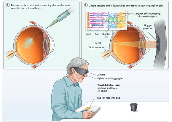 Rhodopsin acts similar like retinal photorecptors. Therefore, an adenovirus was used to transfect rhodopsin (ChR2) into the ganglion cells of the retina. Ganglion cells transmit the signals of rods and cones to the brain. So when light was sensed by these rhodopsins in the ganglion cells, the ganglion cells were activated and could send the signal to the brain. Light sensation was done with the use of light-stimulated goggles.