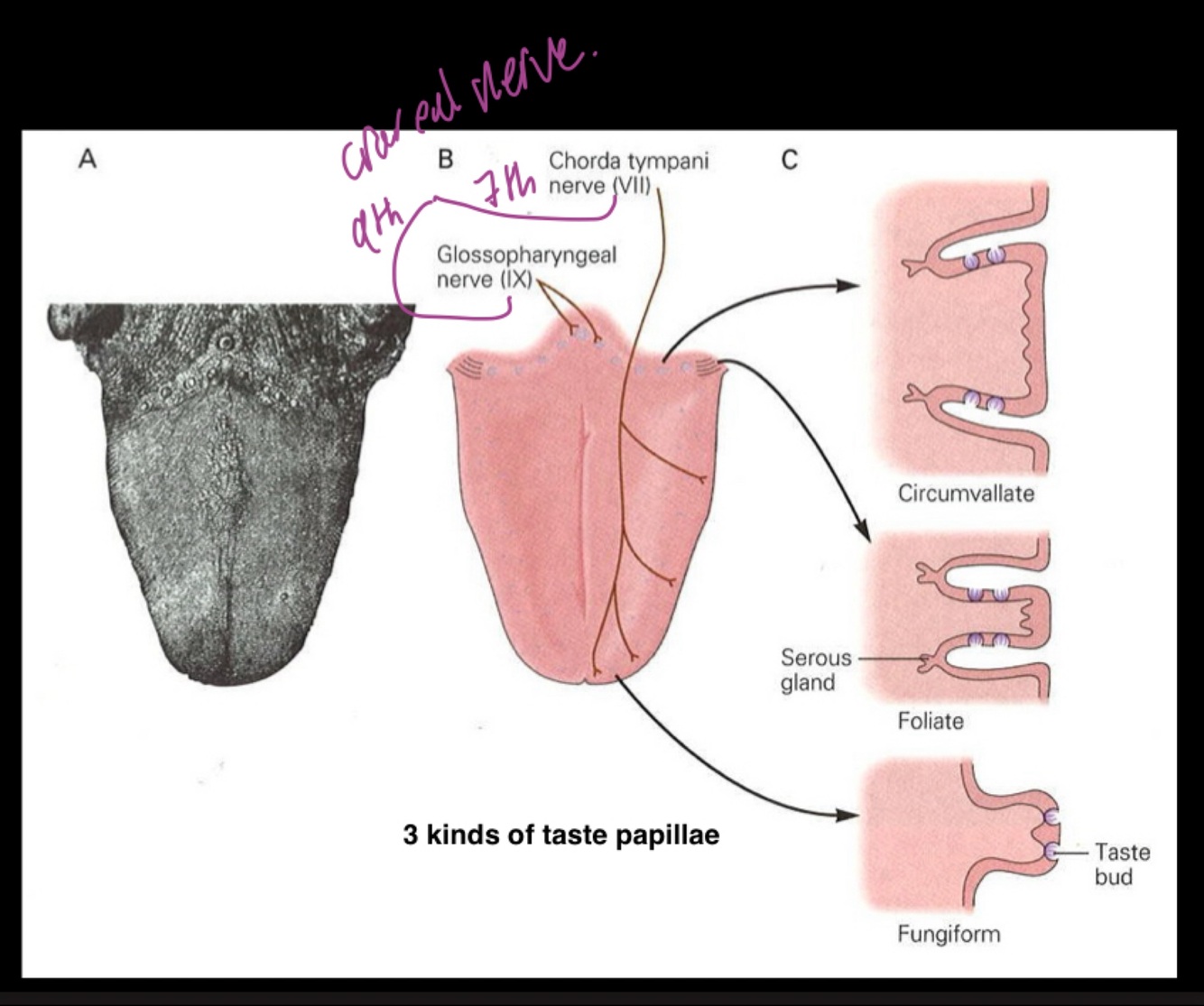 What are the 3 kinds of papillae in the tongue?