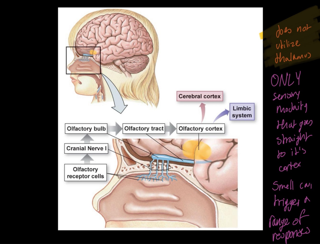 Define the pathway of olfaction. What special about it?