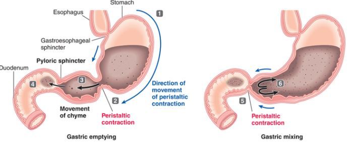 Describe the process of gastric emptying (1-4) and gastric mixing (5-6)