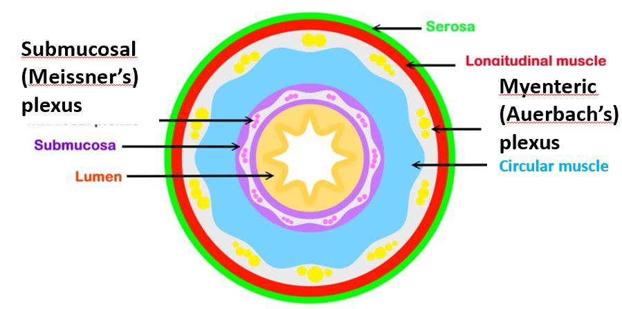 Auerbach’s (myenteric) plexus- between longitudinal and circular muscle