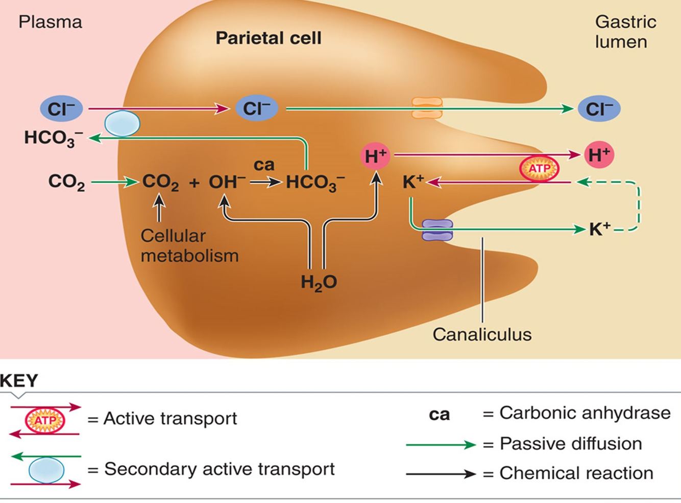 The stomach’s parietal cells actively secrete H1 and Cl2 by the actions of two separate pumps. H1 is secreted into the lumen by a primary H1–K1 ATPase active-transport pump at the parietal cell’s luminal border. The H1 that is secreted, as well as HCO32, is formed within the parietal cell from H2O and CO2 in a reaction catalyzed by carbonic anhydrase. Cl2 is secreted by secondary active transport. Driven by the HCO32 concentration gradient, a Cl2–HCO32 antiporter in the basolateral membrane transports HCO32 down its concentration gradient into the plasma and simultaneously transports Cl2 into the parietal cell against its concentration gradient. Cl2 secretion is completed as the Cl2 that entered from the plasma diffuses out of the cell down its electrochemical gradient through a luminal Cl2 channel into the lumen.