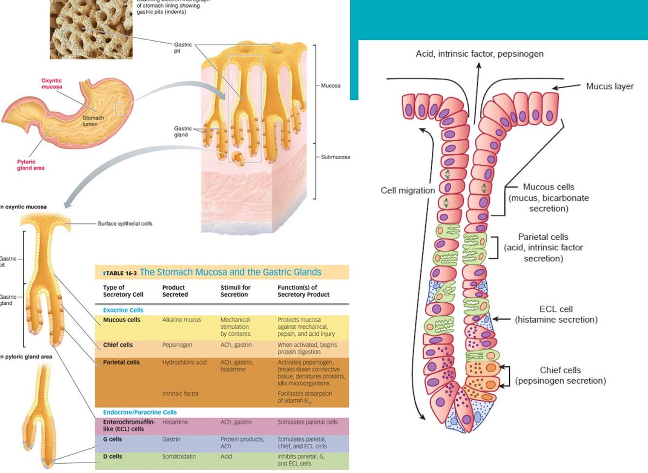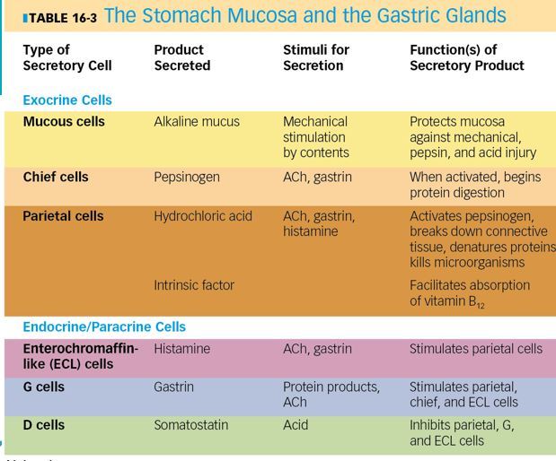 –Exocrine secretory cells in the walls of the pits and glands: mucous, chief, and parietal