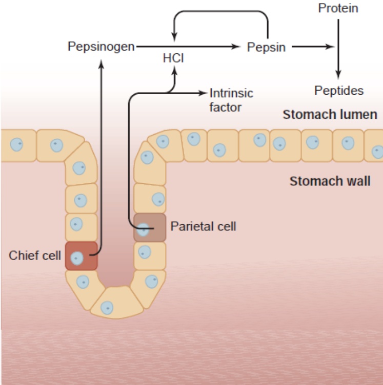 •Pepsinogen is activated to pepsin, which begins protein digestion