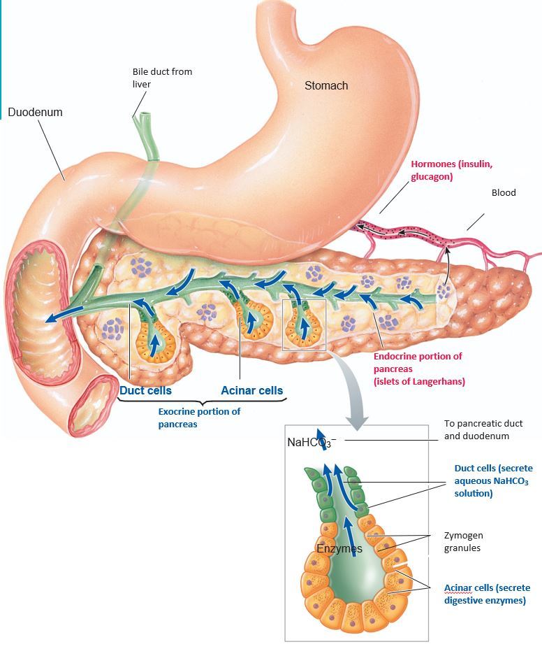 The exocrine pancreas secretes into the duodenal lumen a digestive juice composed of digestive enzymes secreted by the acinar cells and an aqueous NaHCO3 solution secreted by the duct cells.