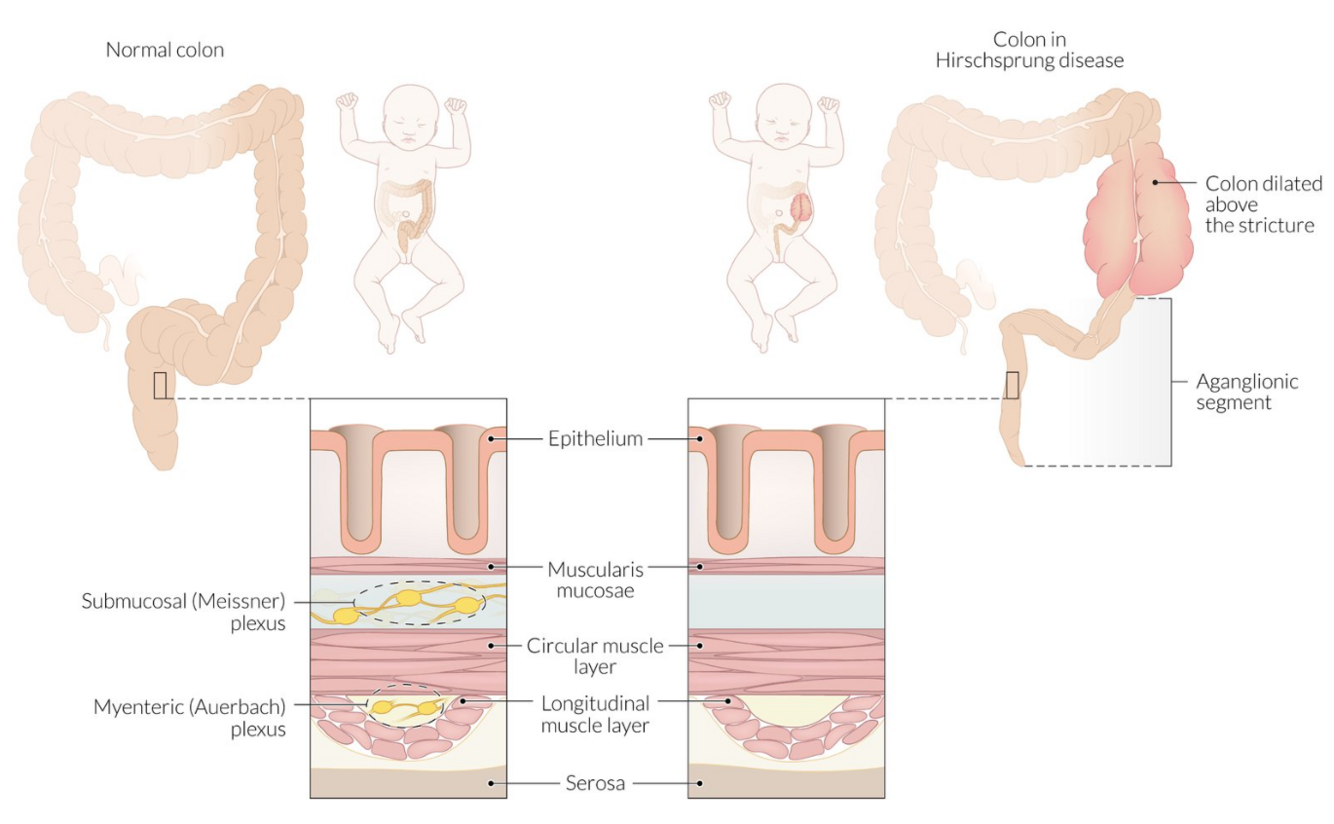 mpaired migration of neural crest cells is the underlying cause of Hirschsprung disease. Parasympathetic neural crest cells migrate in a rostral to caudal direction, from the foregut to the midgut to the hindgut. Failure of the neural crest cells to complete this migration typically results in an aganglionic distal sigmoid and rectum (i.e., without the myenteric and submucosal plexus). As a result, there is hypertonicity in the walls of the rectum and sigmoid, and the internal anal sphincter fails to relax in response to rectal distention. The net effect is intestinal obstruction and dilation of the colon (megacolon). The diagnosis is confirmed via rectal biopsy, which would show aganglionosis, increased acetylcholinesterase activity, and/or hyperplasia of parasympathetic fibers.