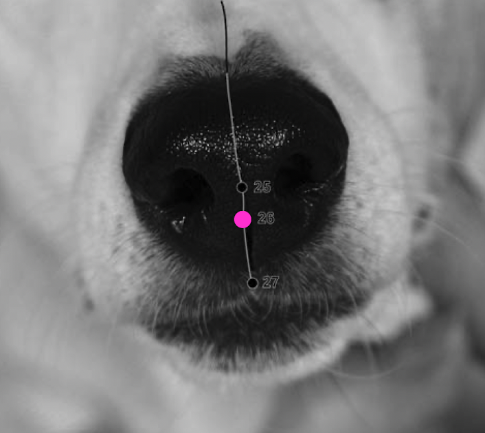 in the philtrum (the vertical line on the upper lip and between the nostrils) at the level of the ventral limits of the nostrils in the non haired skin