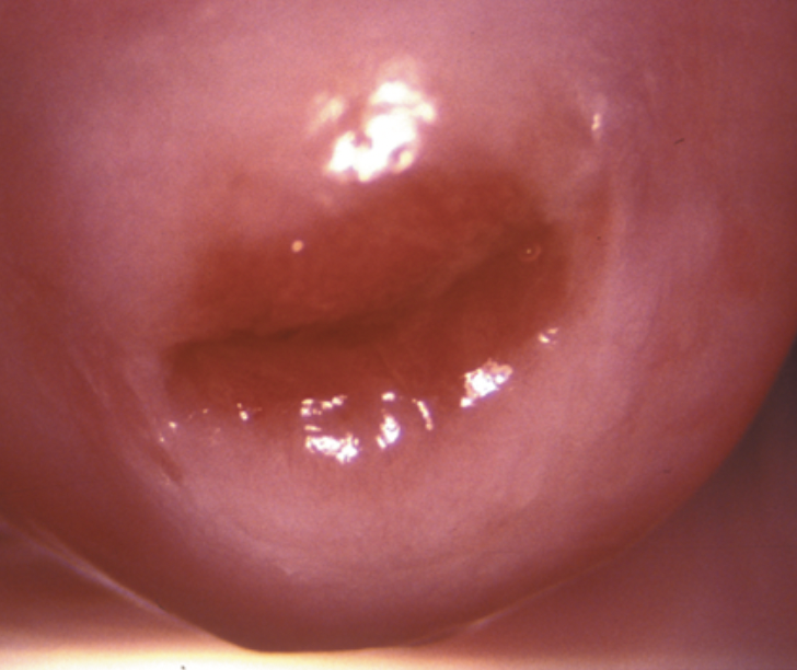 well-demarcated border between the redder, velvety columnar epithelium extending from the os and the pale pink squamous epithelium of the endocervix