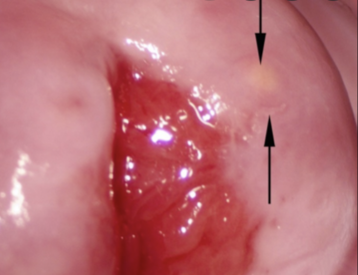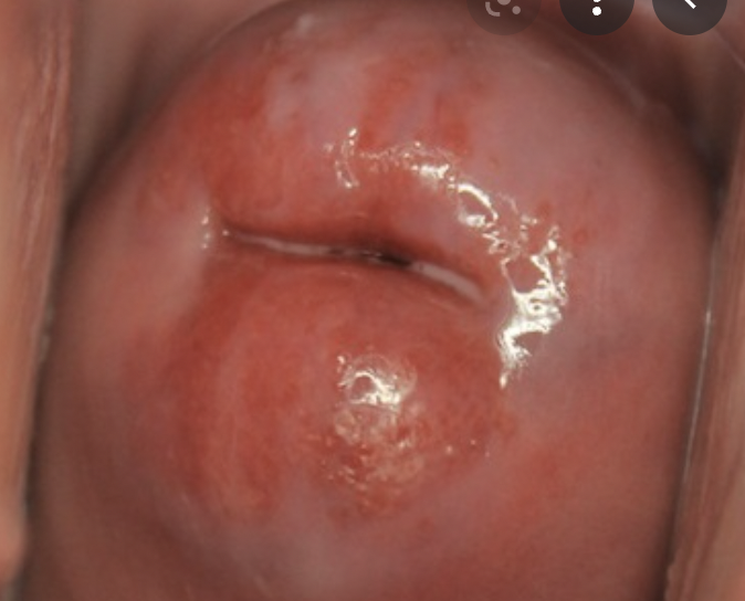 the lining becomes visible on examination of the cervix using a speculum - has a different appearance to the normal endocervix