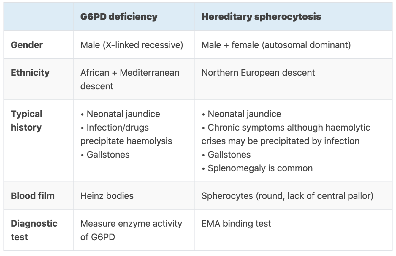 compare G6PD deficiency and heredetary spherocytosis with regards to gender, ethnicity, typical history, blood film, and diagnostic tests