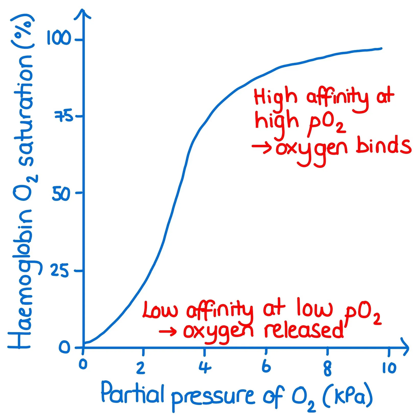 higher oxygen partial pressure - Middle of the curve (when the gradient of the curve steepens): first oxygen molecule changes the Quaternary structure of the haemoglobin molecule = changes shape = easier or the other subunits to bind to an oxygen molecule **(positive cooperativity)**