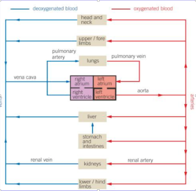 blood is confined to vessels and passes twice through the heart for each complete circuit of the body