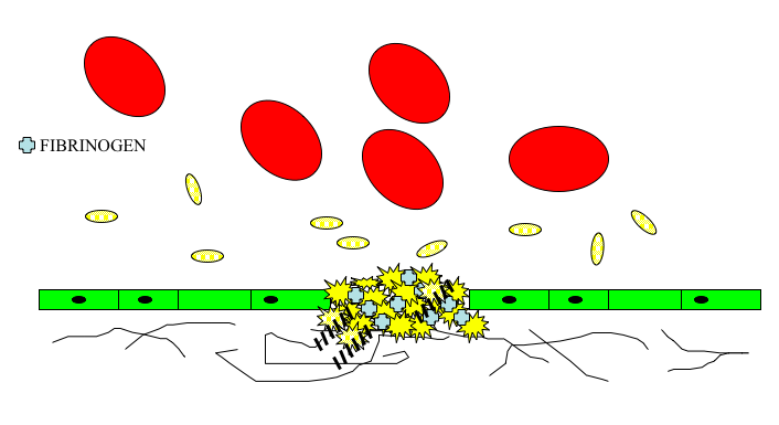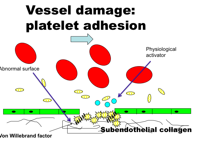 Platelets see an abnormal surface, has a receptor for the collagen, and binds to it