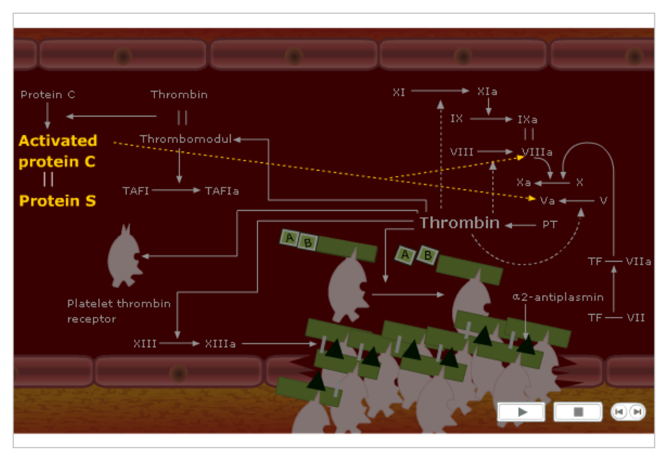 Activated protein C binds to its cofactor protein S and these molecules switch of activated factor 8 and 5 and stopping thrombin production and reducing the clot formation