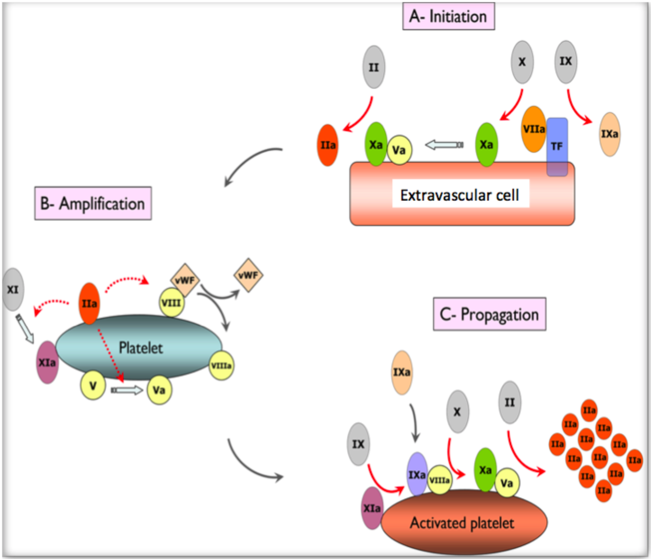 Factor 6 converts more factor IX to factor IXa, which in cocert with factor VIIa, amplifies the conversion of factor X to Xa and there is a rapid burst in thrombin generation which cleaves fibrinogen to form fibrin