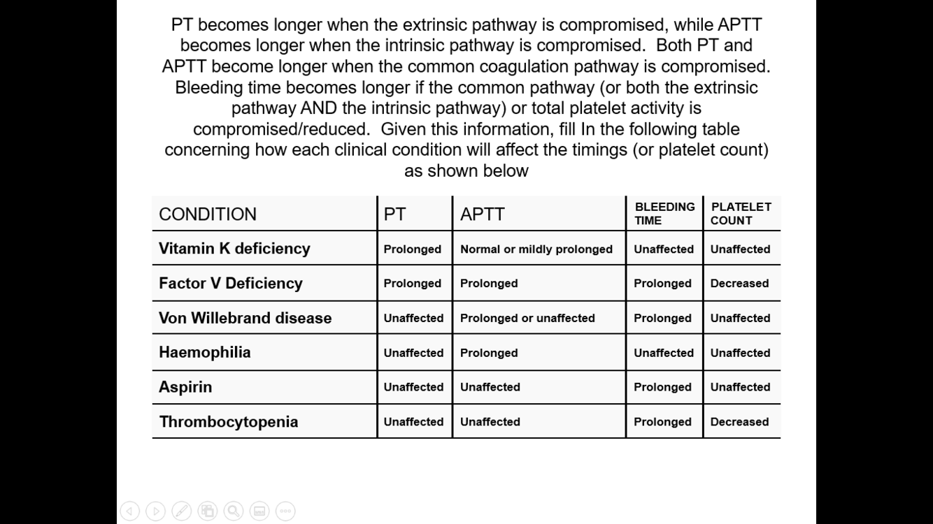 PT becomes longer when the extrinsic pathway is compromised, while APTT becomes longer when the intrinsic pathway is compromised. Both PT and APTT become longer when the common coagulation pathway is compromised. Bleeding time becomes longer if the common pathway (or both the extrinsic pathway AND the intrinsic pathway) or total platelet activity is compromised/reduced. Given this information, fill In the following table concerning how each clinical condition will affect the timings (or platelet count) as shown below