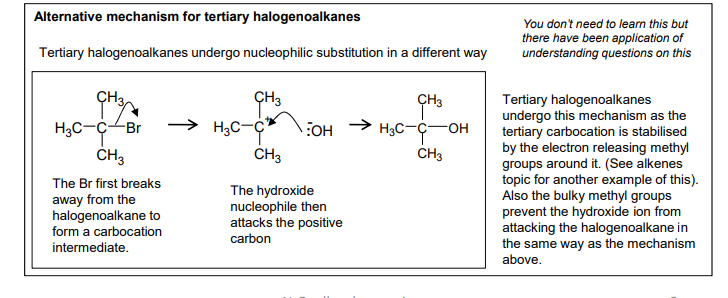 describe why a tertiary halogenoalkane undergoes nucleophilic substitution differently