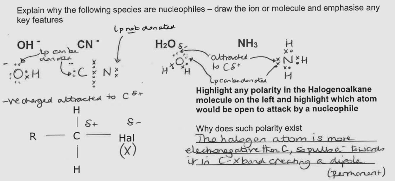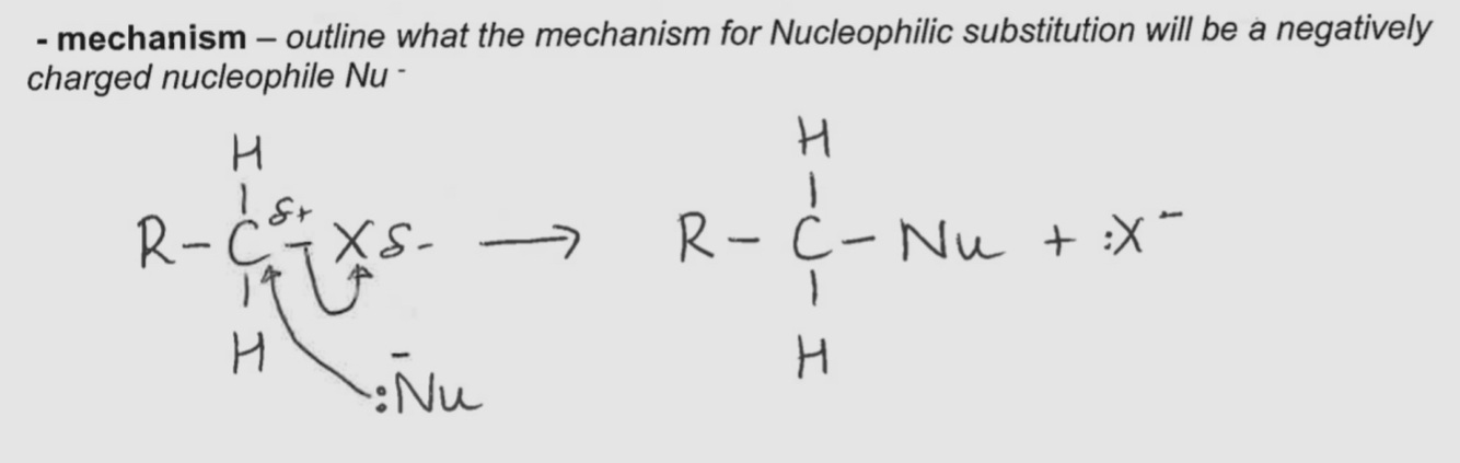 A lone pair on the nucleophile is donated and used to form a covalent bond between the nucleophiles and the C delta +. The C - X bond breaks hetrolytically forming X- ion ie the X atom is swapped for the nucleophile