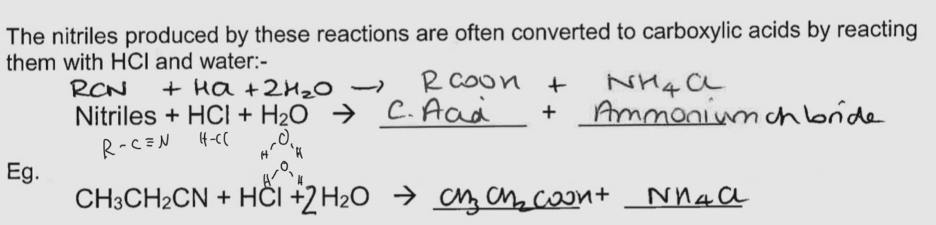 This involves reacting the Nitrile with HCl and H2O forming a carboxilic acid and NH4Cl.