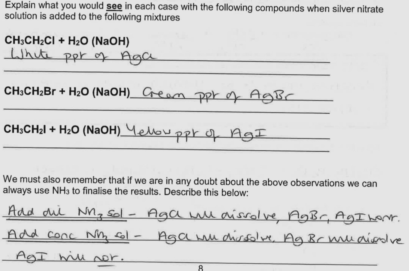 - Add AgNO3 solution to the halogenoalkane . The water/NaOH reacts with the RX to give an alcohol and Halide ion X-. The X- ion produced will react with the Ag+ ions to form an insoluble ppt of AgX.
