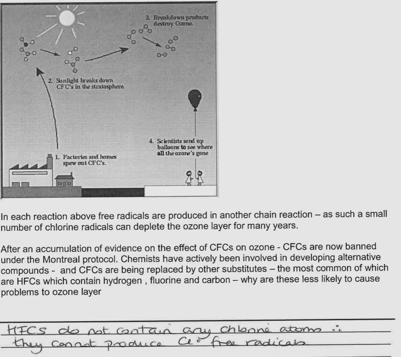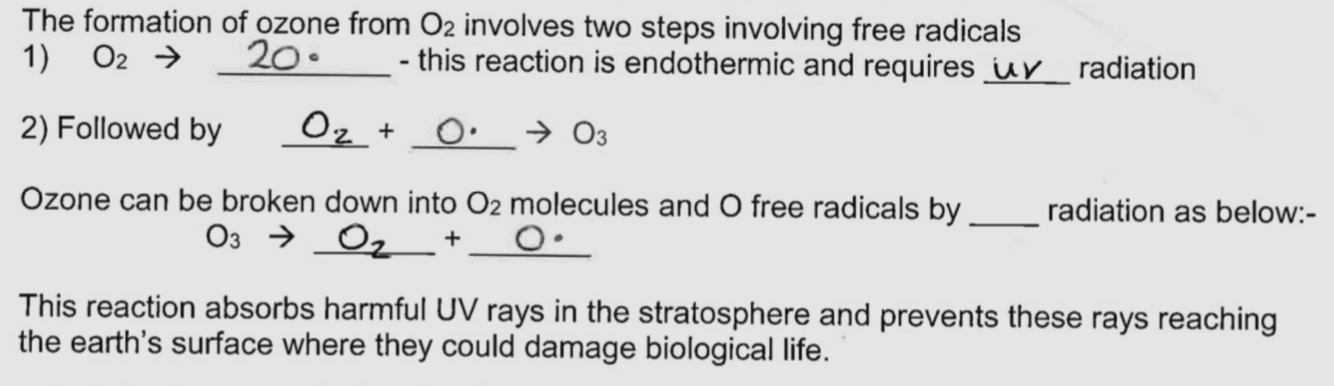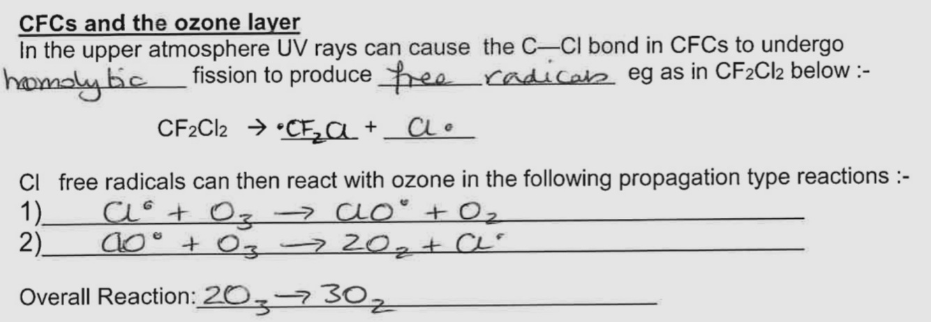 CFC’s can release Cl. Free radicals which react with ozone breaking it down into oxygen which depletes the ozone layer.