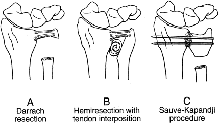 Method: Resection of varying amount of carpus, shortening of ECU, angular osteotomy of ulna, distraction external fixator
