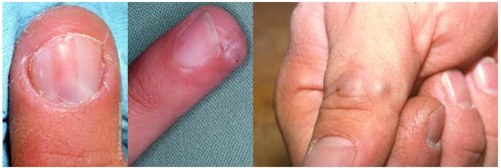 Signs: bluish discolouration, nail ridging/discolouration