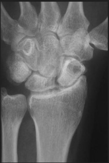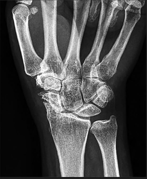 A 67-year-old woman presents with chronic insidiously progressive right wrist pain. Her history is only significant for a remote fall onto her wrist 25 years prior.