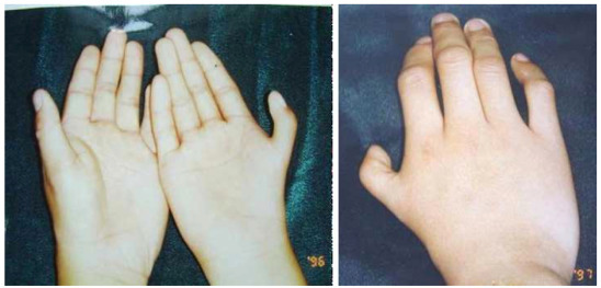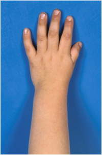 1.Deformity of the hand- absent thumb.
