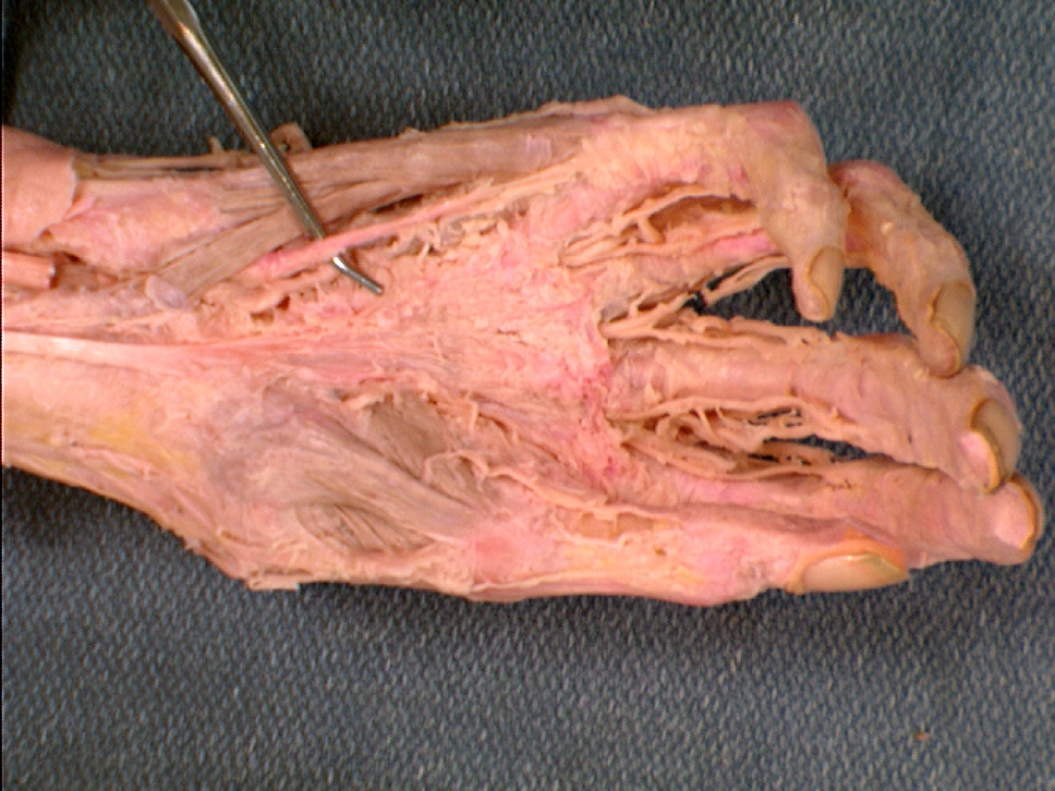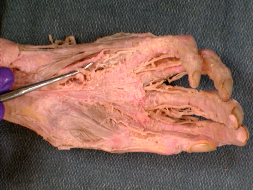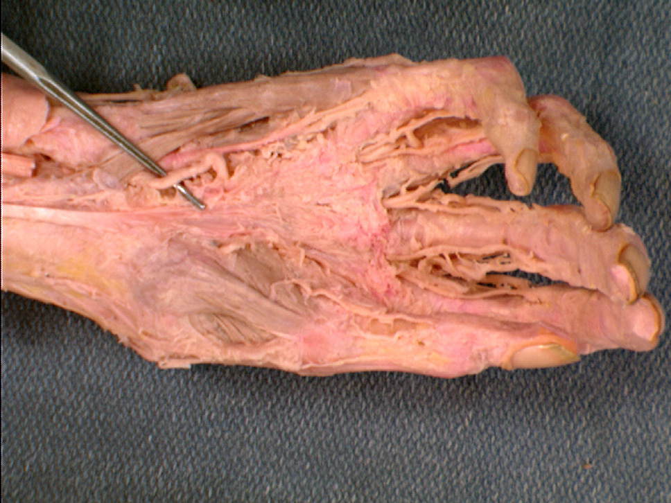 As it crosses the deep part of the hand, it supplies all the interosseous muscles and the third and fourth lumbricals.