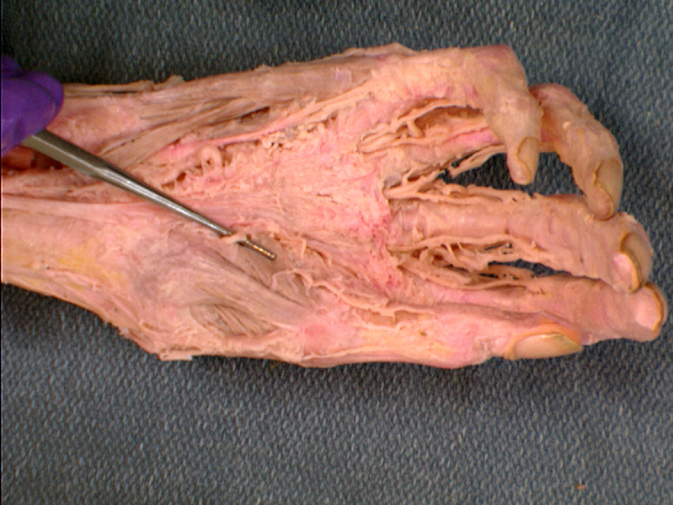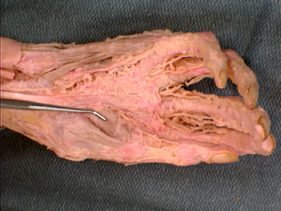 beneath the long flexor tendons and the lumbrical muscles at the center of the palm.